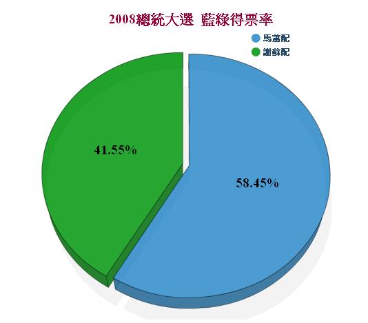 臺灣“中選會(huì )”公布,14401個(gè)開(kāi)票所完成點(diǎn)票,馬英九得7,658,724票;謝長(cháng)廷得5,445,239票。得票比例為58.45%比41.55%。 謝長(cháng)廷恭喜馬英九當選。